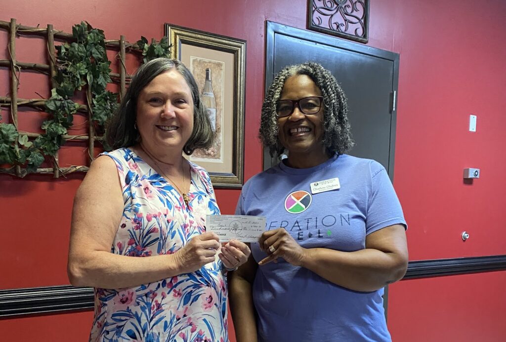 Kiwanis members Brandon and Martha present a check to the Guilford Backpack Ministry